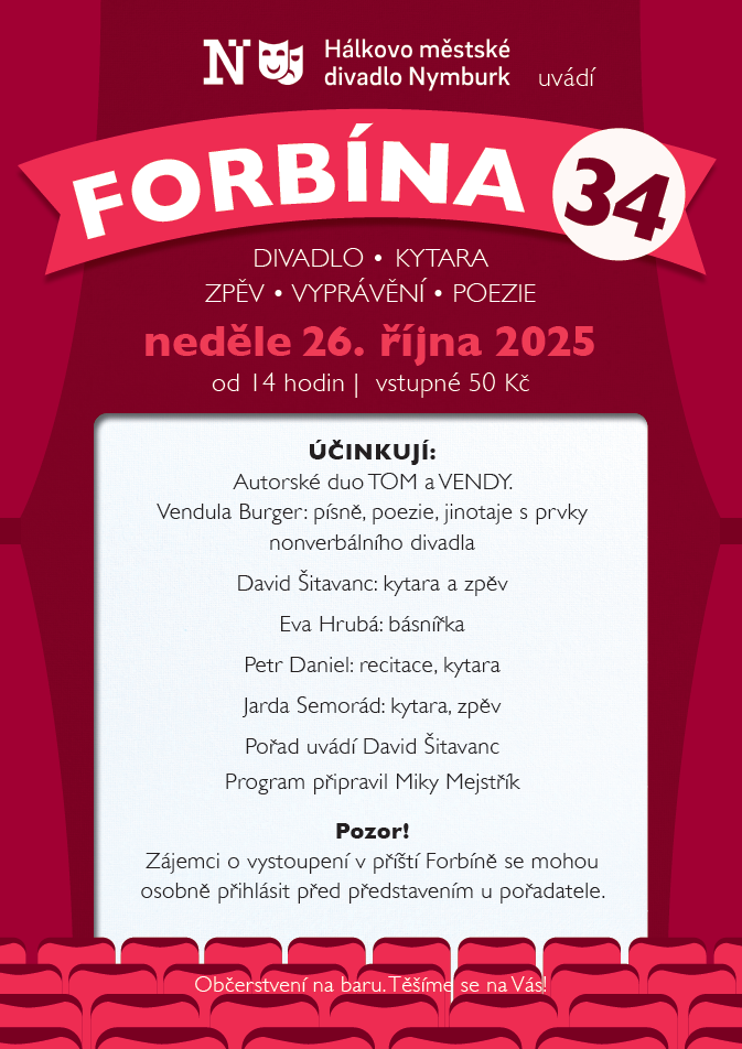 Zájemci o vystoupení v příští Forbíně se mohou osobně přihlásit před představením u pořadatele. Kdy:26.10.2025 14:00Kde:Hálkovo městské divadlo Nymburk