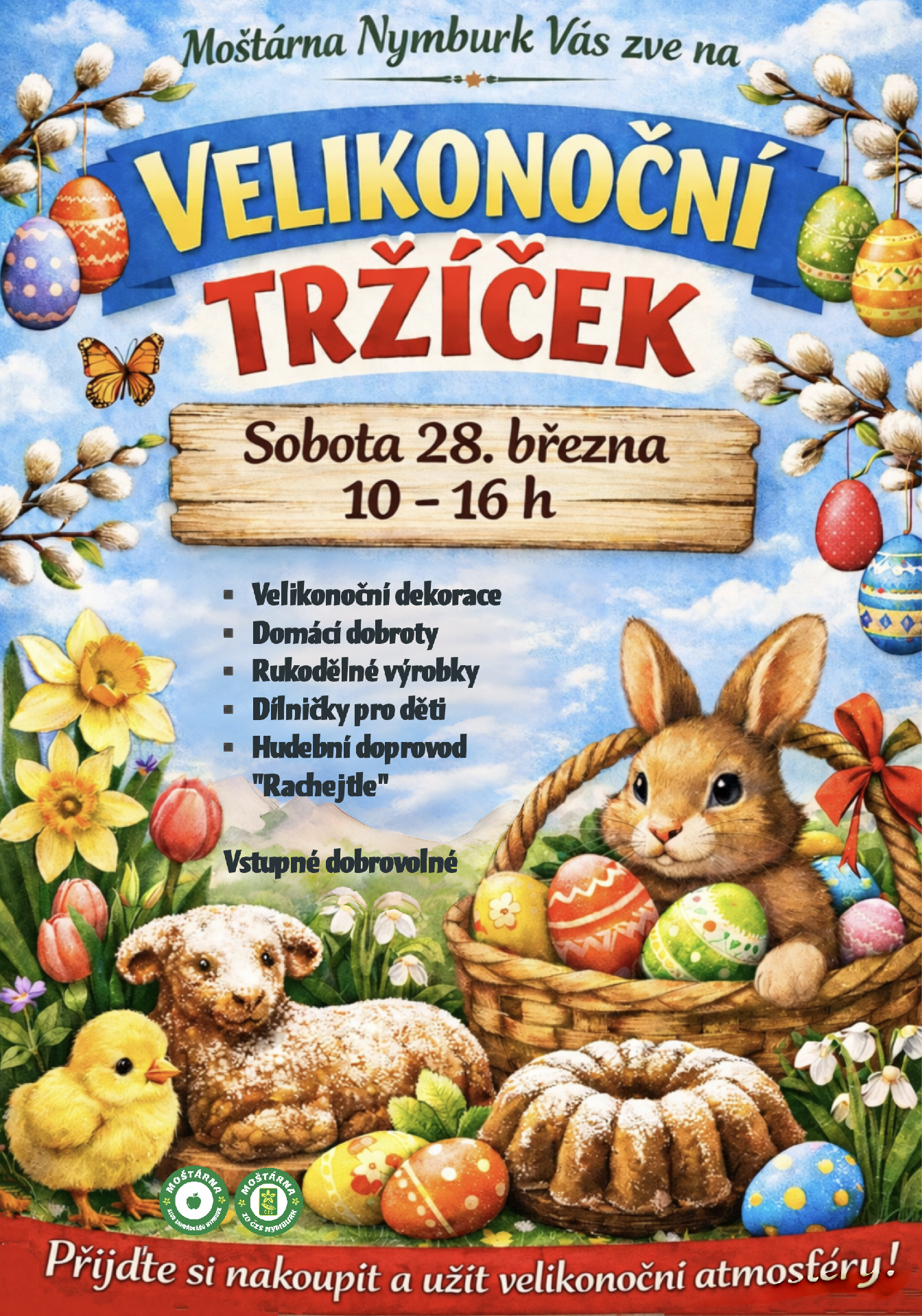 Těšit se můžete na velikonoční dekorace, domácí dobroty, rukodělné výrobky, dílničky pro děti i hudební doprovod Rachejtle.